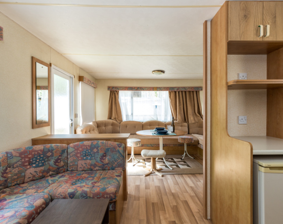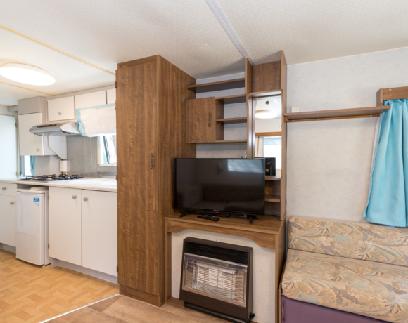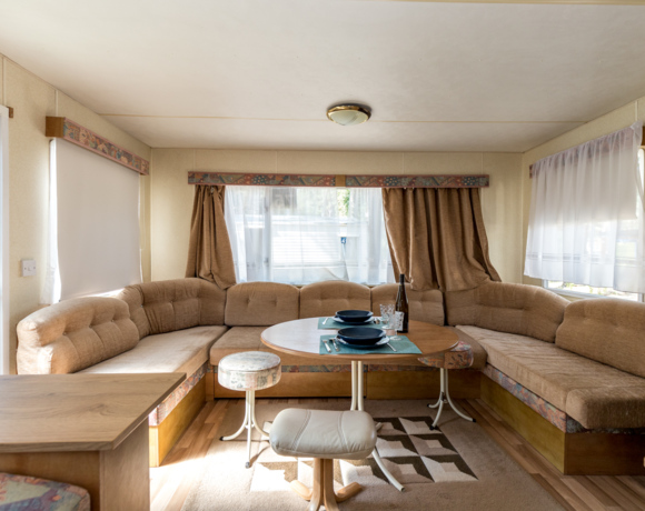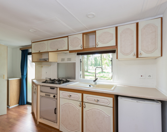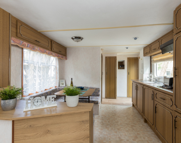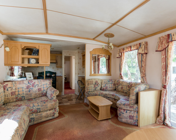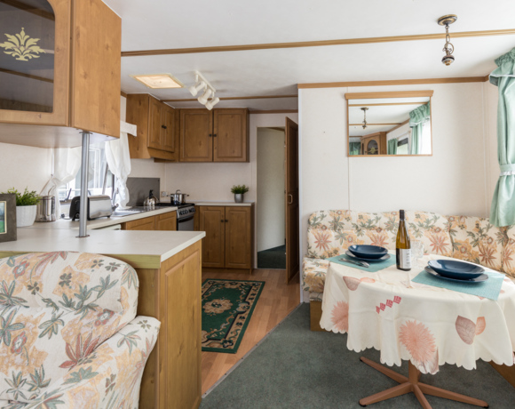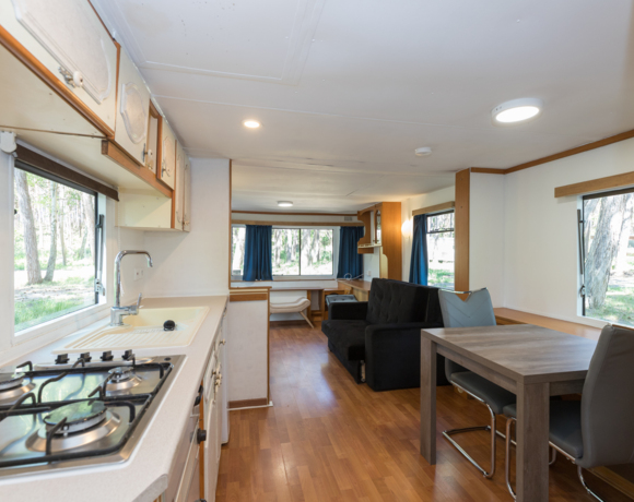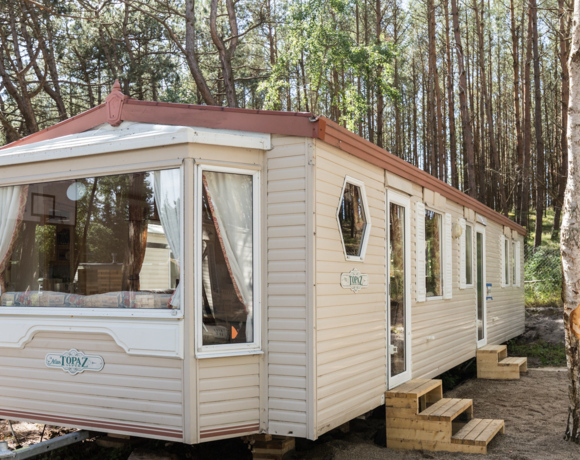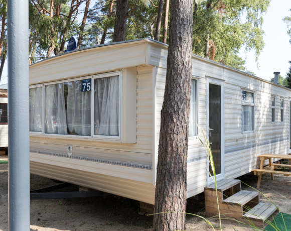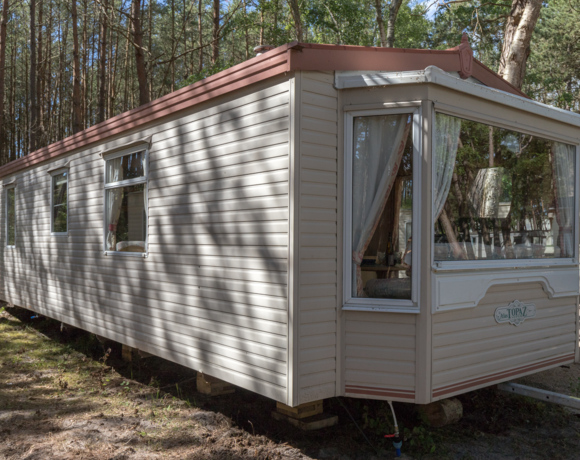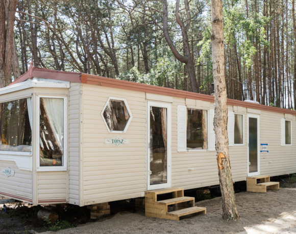 Nasz domek mobilny o rozmiarze 9,75x3,65 metrów z 2 sypialniami oferuje komfortowy pobyt w otoczeniu natury. Przestronna kuchnia i jasny salon z telewizorem oraz łazienka zapewniają pełne wyposażenie.