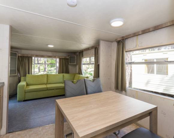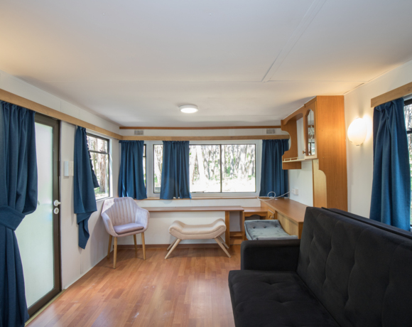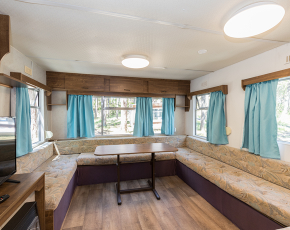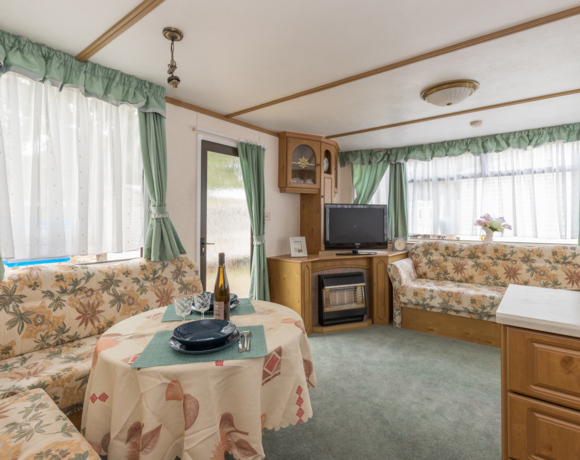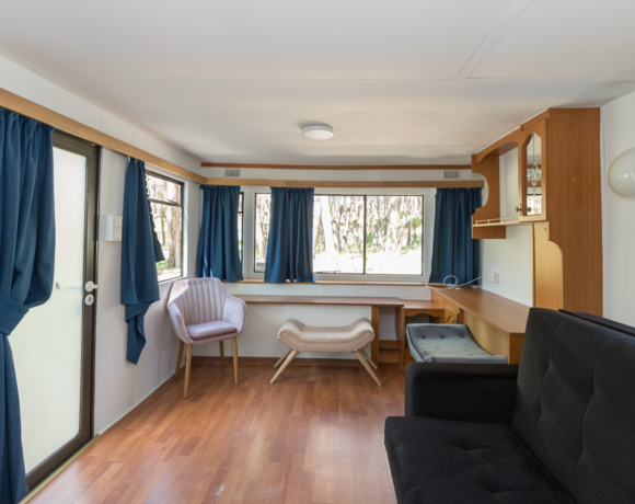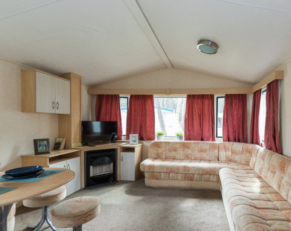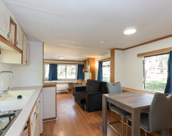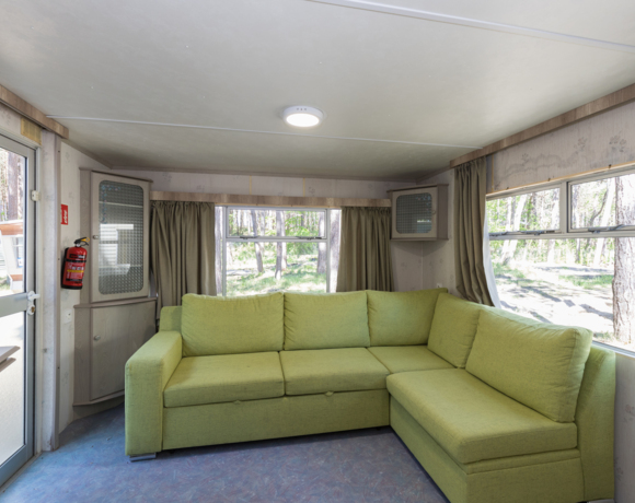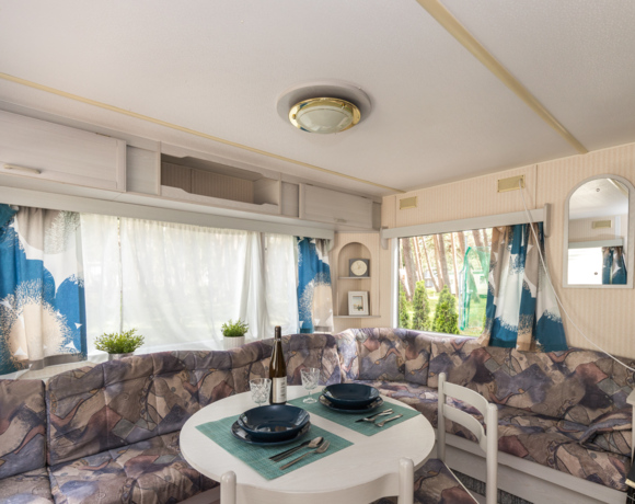 Nasz domek mobilny o rozmiarze 11,58x3,65 metrów z 2 sypialniami oferuje komfortowy pobyt w otoczeniu natury. Przestronna kuchnia i jasny salon z telewizorem oraz łazienka zapewniają pełne wyposażenie.
